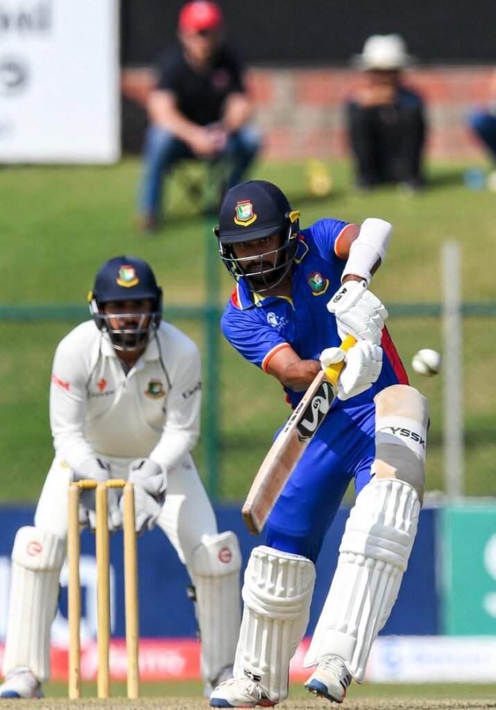 दिन ओपनर महमुदुल हसन जॉय के नाम रहा, जिन्होंने टेस्ट क्रिकेट की असली भावना को दिखाया। बेहतरीन एकाग्रता और मजबूत डिफेंसिव तकनीक के साथ जॉय ने दिन के अंत तक नाबाद 128* रन बनाए। उनकी पारी धैर्य की मिसाल थी — उन्होंने नई गेंद को झेला, शुरुआती दबाव संभाला और फिर समझदारी से रन बटोरे।